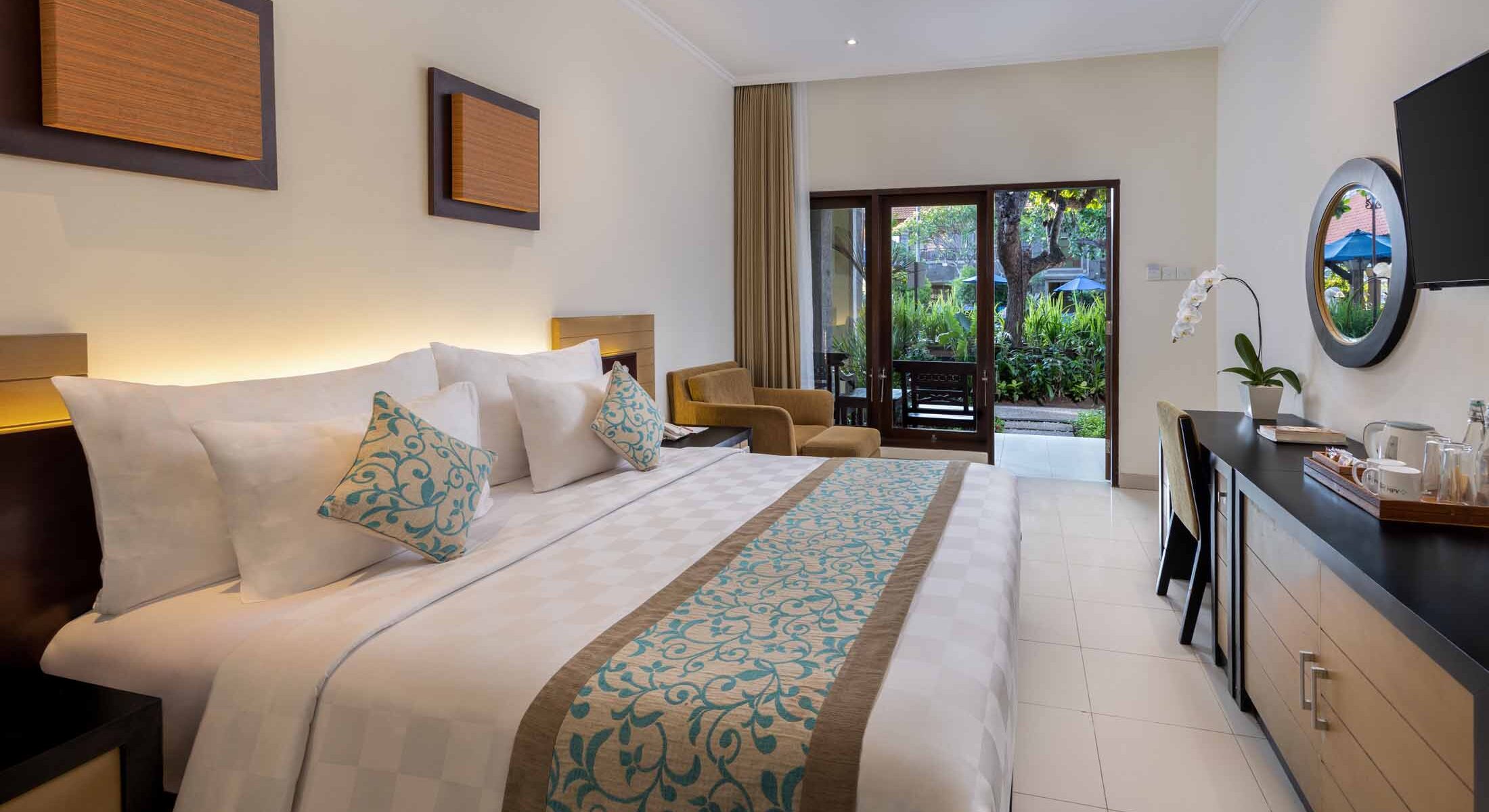 Enjoy enhanced comfort in the Deluxe Room at Adhi Jaya Hotel Kuta, featuring a generous 32sqm layout ideal for couples, friends, or family stays. Conveniently located on the ground floor, each room offers a private balcony with soothing pool or garden views, perfect for unwinding in a tropical setting.