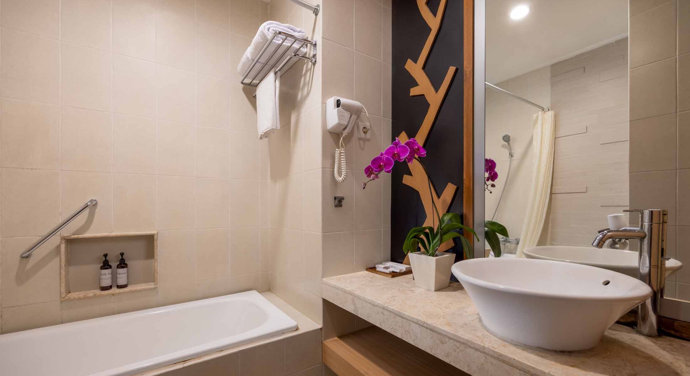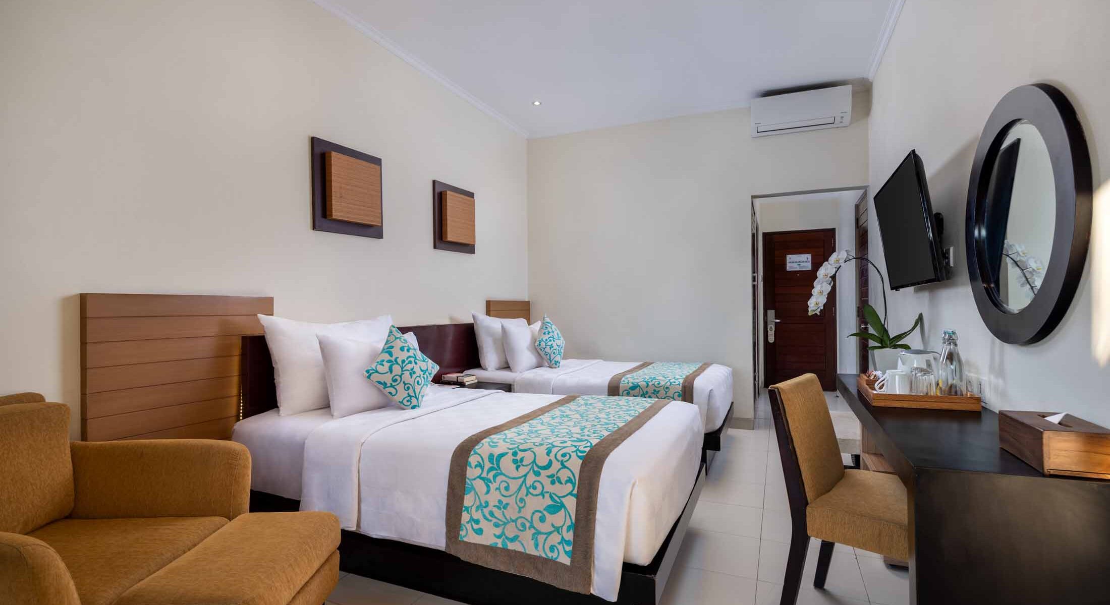 The bathroom is thoughtfully designed with a bathtub and overhead shower, inviting you to relax after a day in Bali. Choose between a king or twin bed, with interconnecting rooms available for families or group travelers. Combining extra space, functional design, and warm Balinese hospitality, the Deluxe Room offers a relaxed and comfortable stay in the heart of Kuta.