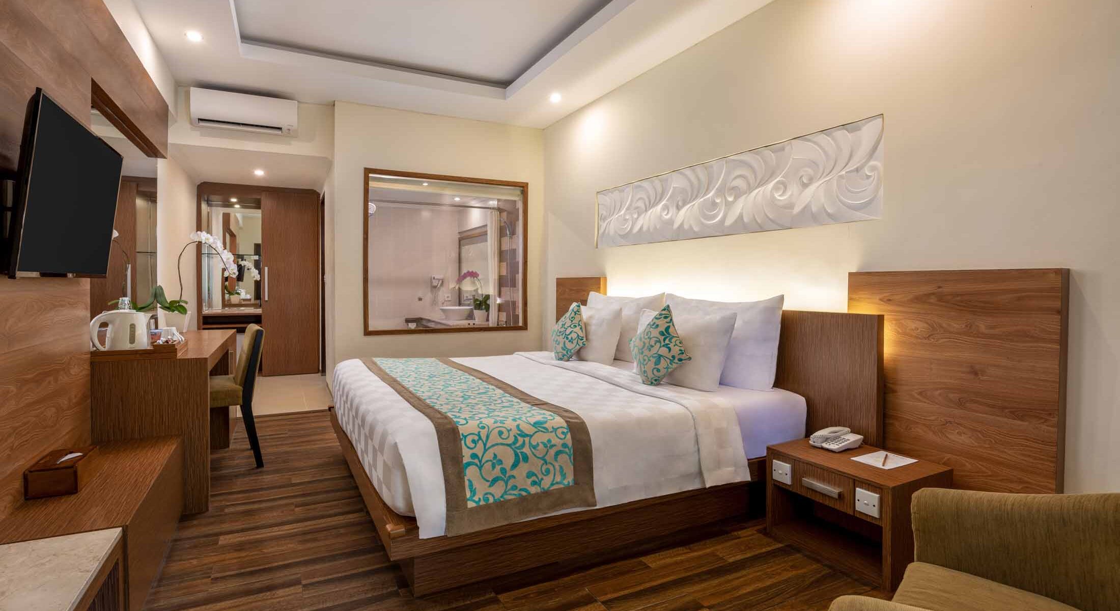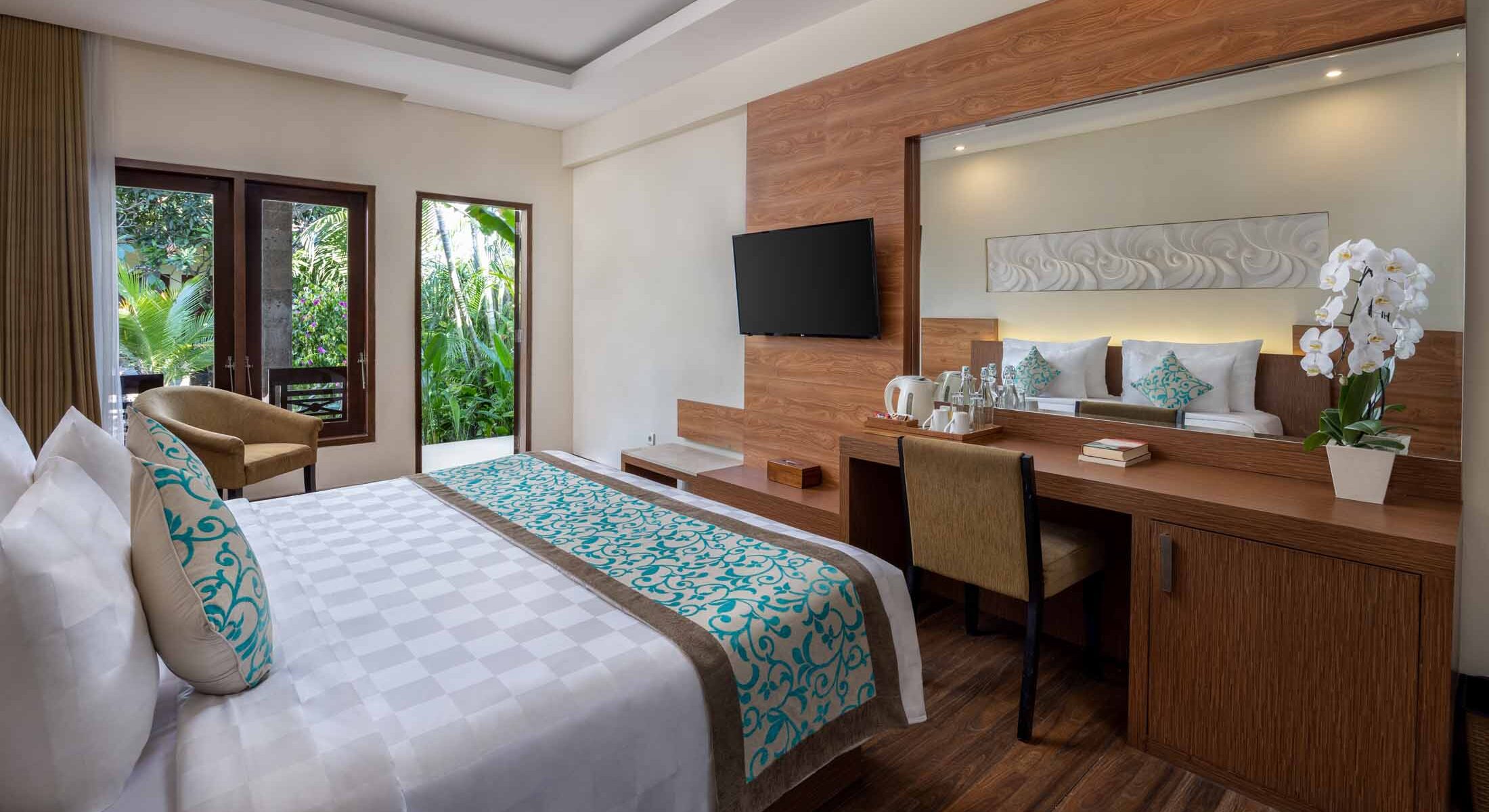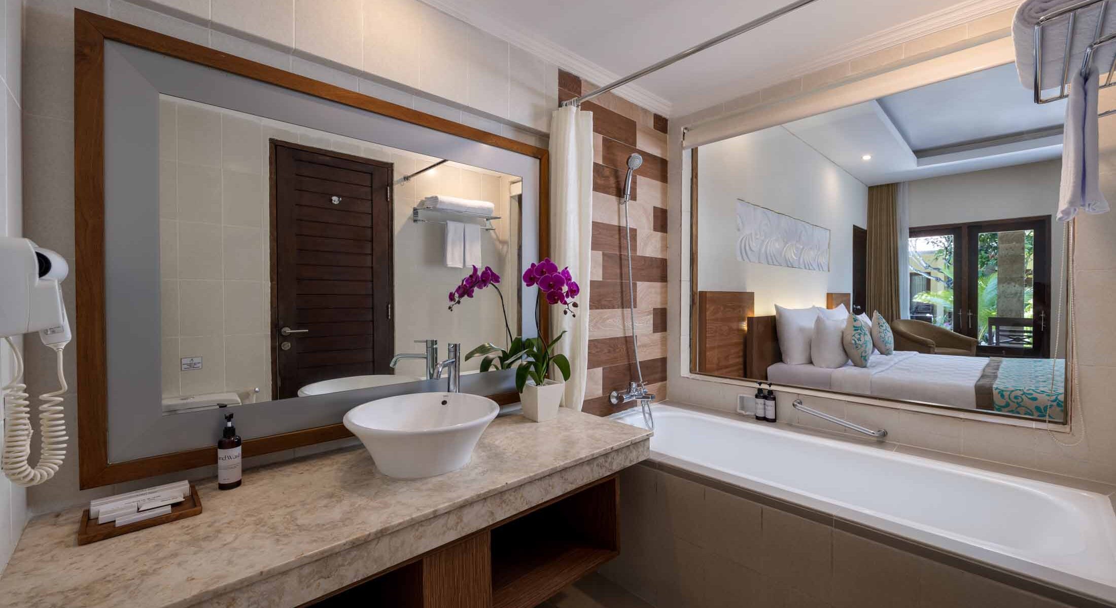 Each room includes a private balcony, inviting you to relax amidst lush surroundings. The bathroom is designed for indulgence with a bathtub and overhead shower, perfect for unwinding after a day in Bali. Choose between a king or twin bed, and enjoy a stay that blends natural calm, refined comfort, and warm Balinese hospitality—an ideal retreat for guests seeking quiet luxury in the heart of Kuta.