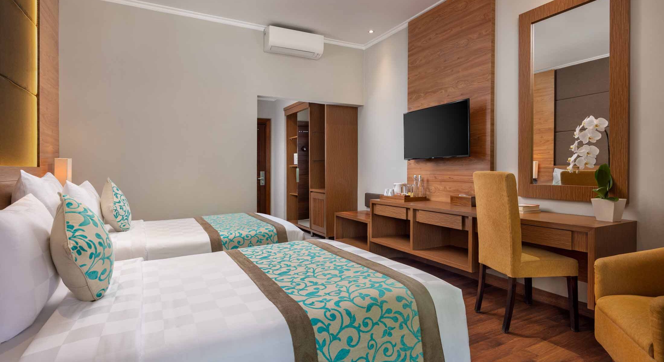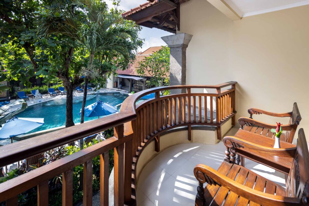 The room is equipped with a modern standing shower, air-conditioned interiors, and a choice of king or twin beds to suit your preference. Blending contemporary comfort with warm Balinese hospitality, the Premier Pool View Room offers a peaceful retreat in the heart of Kuta—perfect for guests who enjoy relaxed mornings and tranquil evenings by the pool.